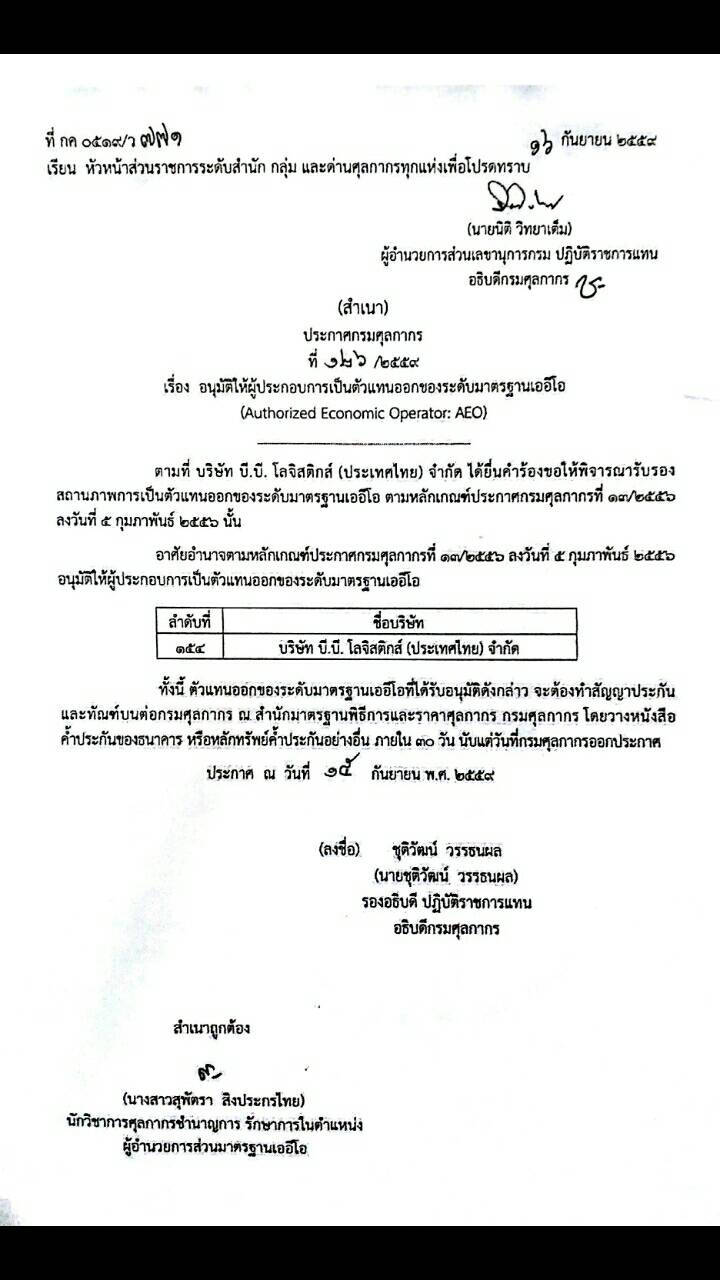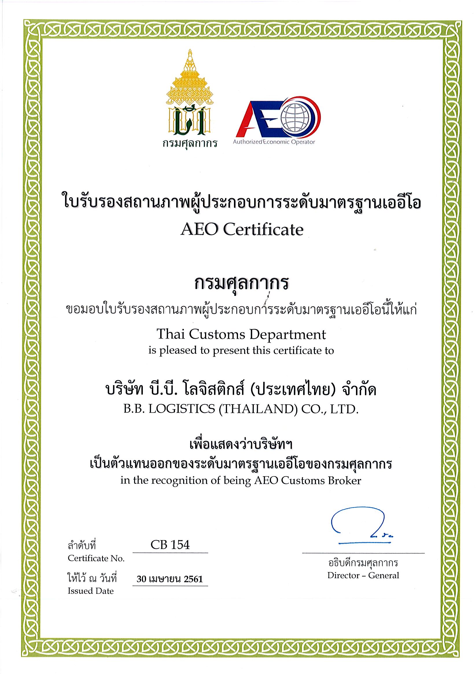 B.B. Logistics (Thailand) today announced has been awarded the prestigious Authrized Economic Operator (AEO) certification by the Thaialnad Customs Department.